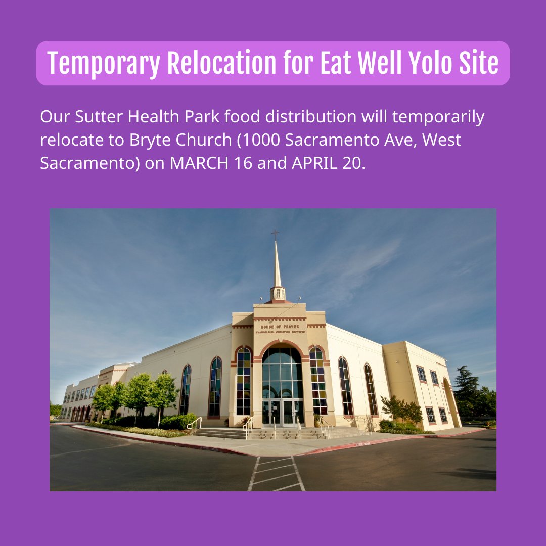 Yolo Food Bank On Twitter Announcement The Eatwellyolo Free Food Distribution Typically Held At Sutter Health Park Will Be Temporarily Relocated To Bryte Church 1000 Sacramento Ave Westsacramento On Wednesday March